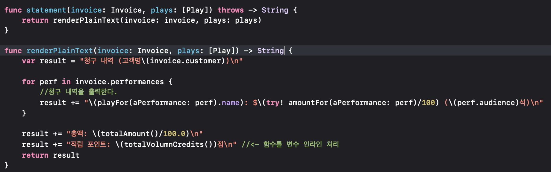 return renderPlainText(data: try createStatementData(invoice: invoice, plays: plays))