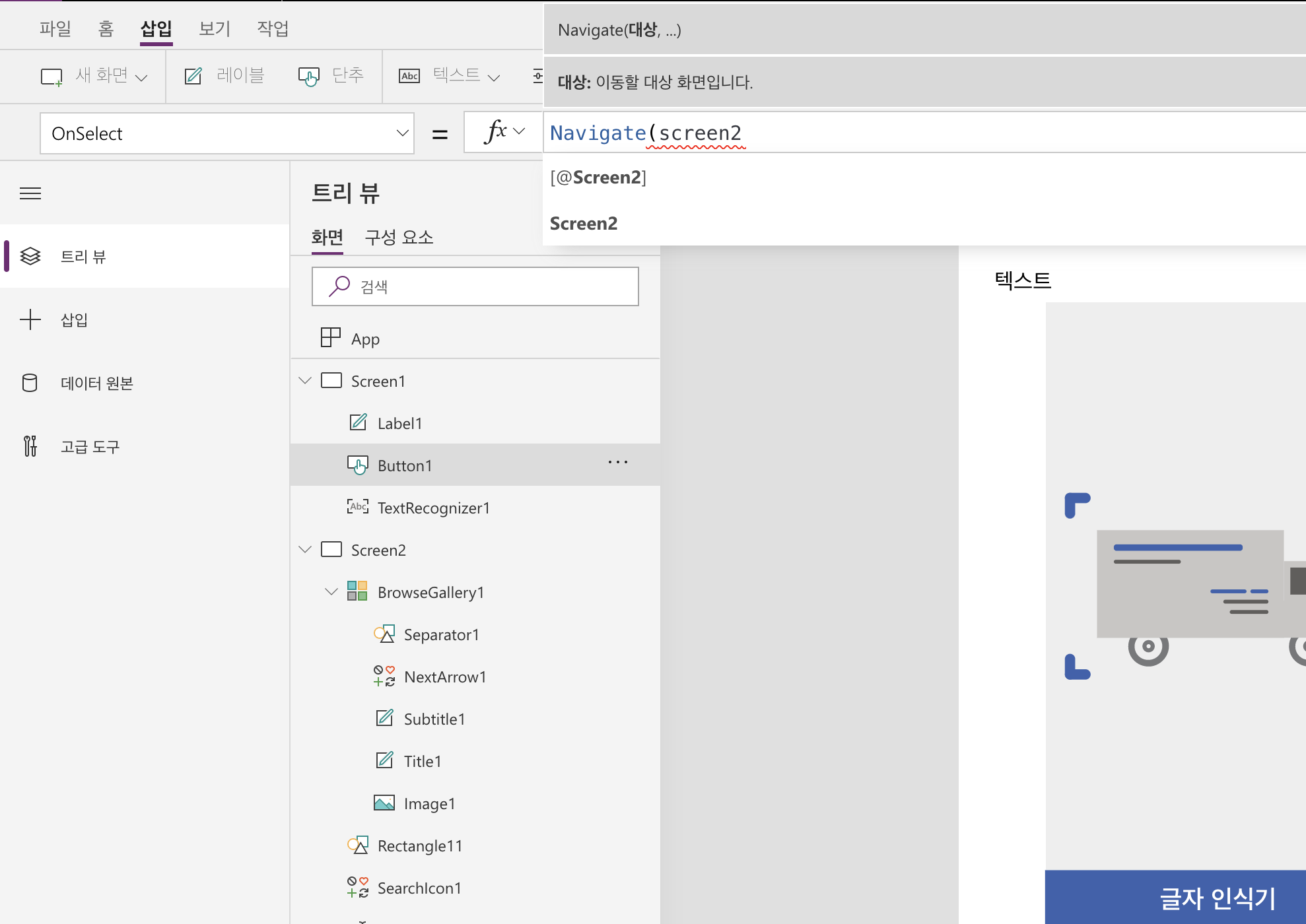 3. 오른쪽 함수창에 Navigate(스크린 이름) 을 입력한다. (엑셀의 함수식 입력하는 것과 비슷하다.)