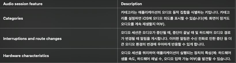 • Audio File Stream Services는 네트워크 연결을 통해 스트리밍된 파일을 재생하는 애플리케이션을 구축할 수 있도록 합니다.