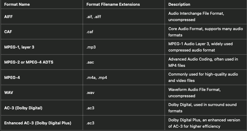 OS X에서는 다양한 코덱과 지원되는 형식을 사용할 수 있으며, 이는 OS X의 Supported Audio File and Data Formats에 설명되어 있습니다.