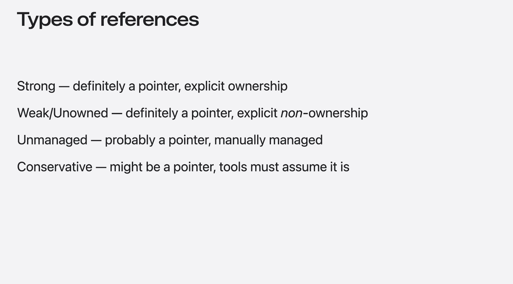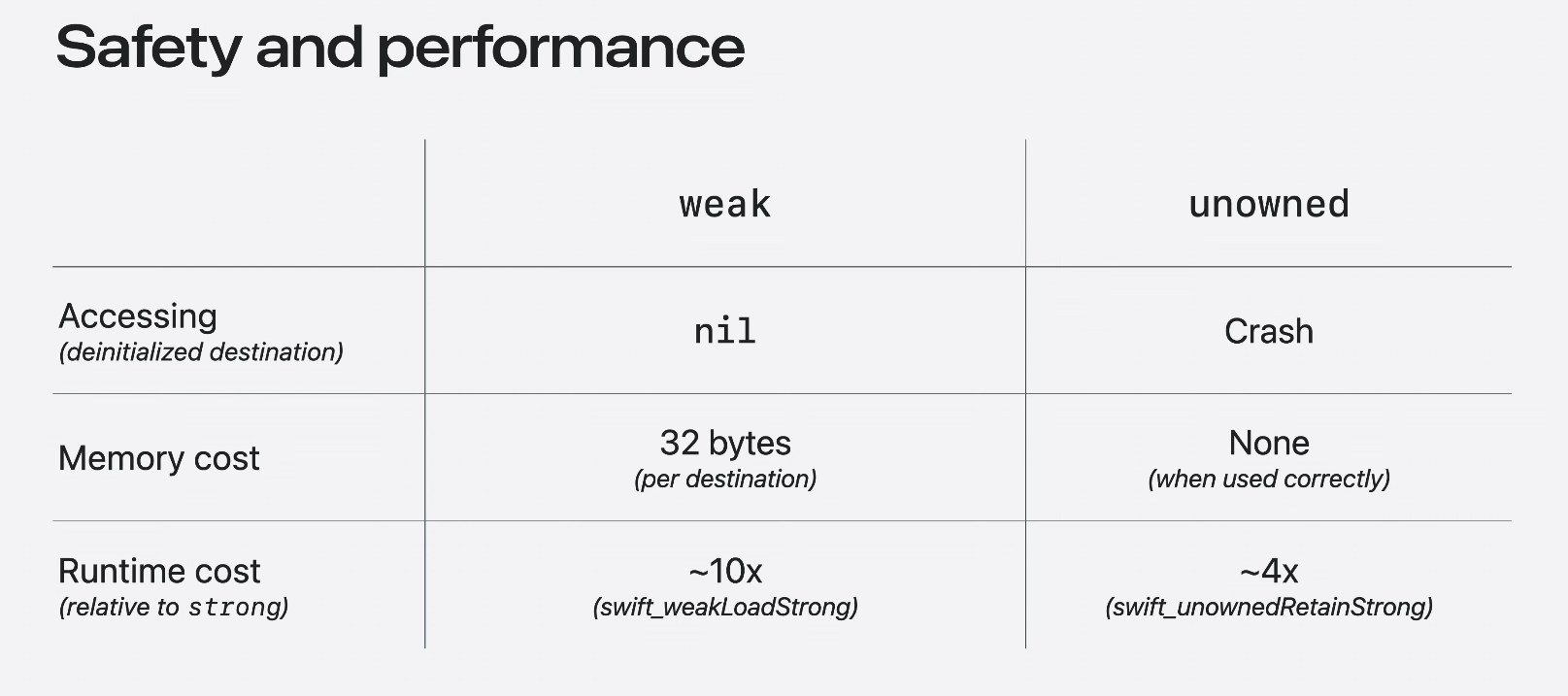 결론: weak reference 가 가장 좋은 기본 값이며 unowned reference 는 reference가 대상보다 오래 지속되지 않도록 보장할 수 있어 메모리와 시간을 절약할 수 있다.