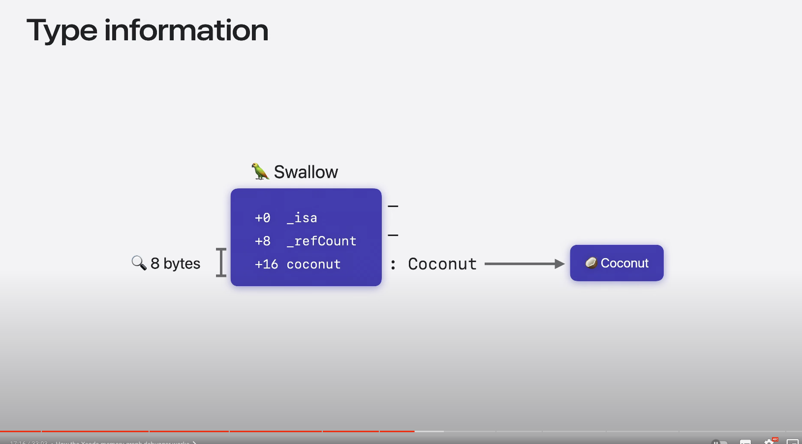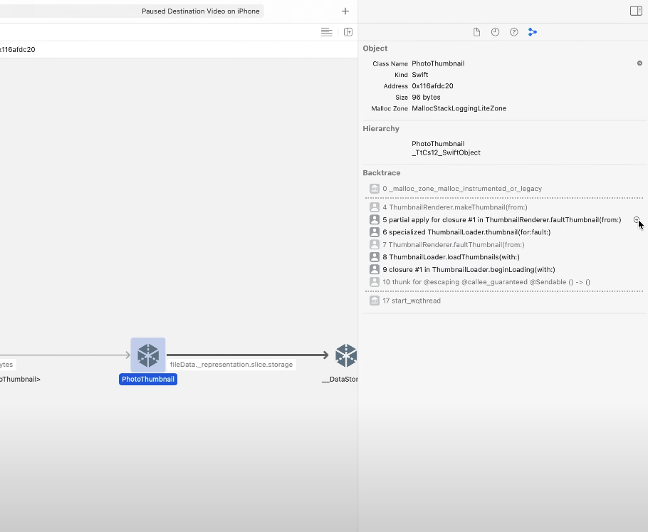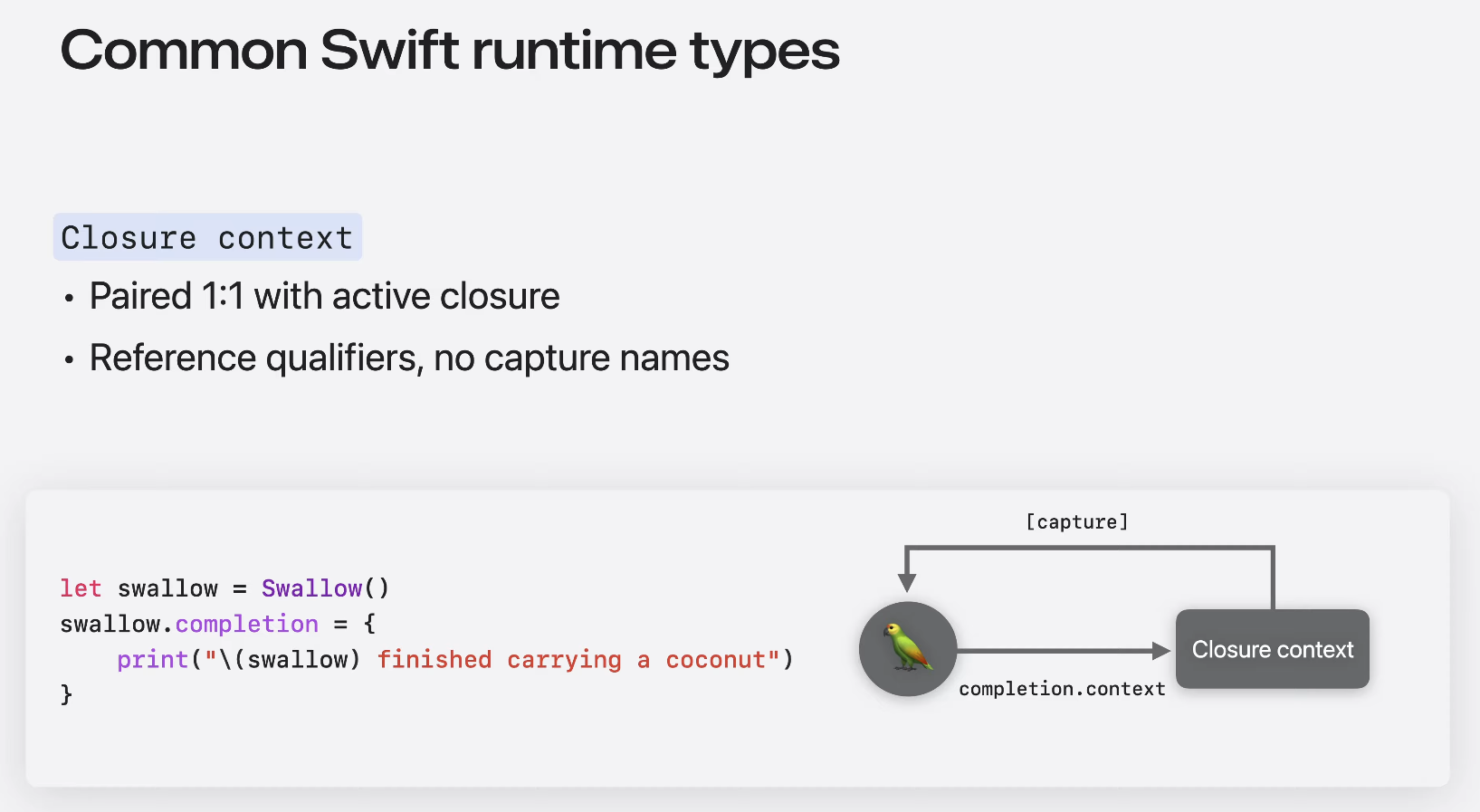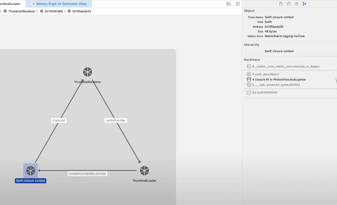 Swallow 예시의 경우 메모리 그래프 디버거에서는 해당 참조를 강력한 캡쳐로 표시하지만 클로져 메타 데이터에는 변수 이름이 포함되지 않는다 -> 클로저 컨텍스트의 모든 참조에는 단순히 "capture"라는 레이블이 지정된다
