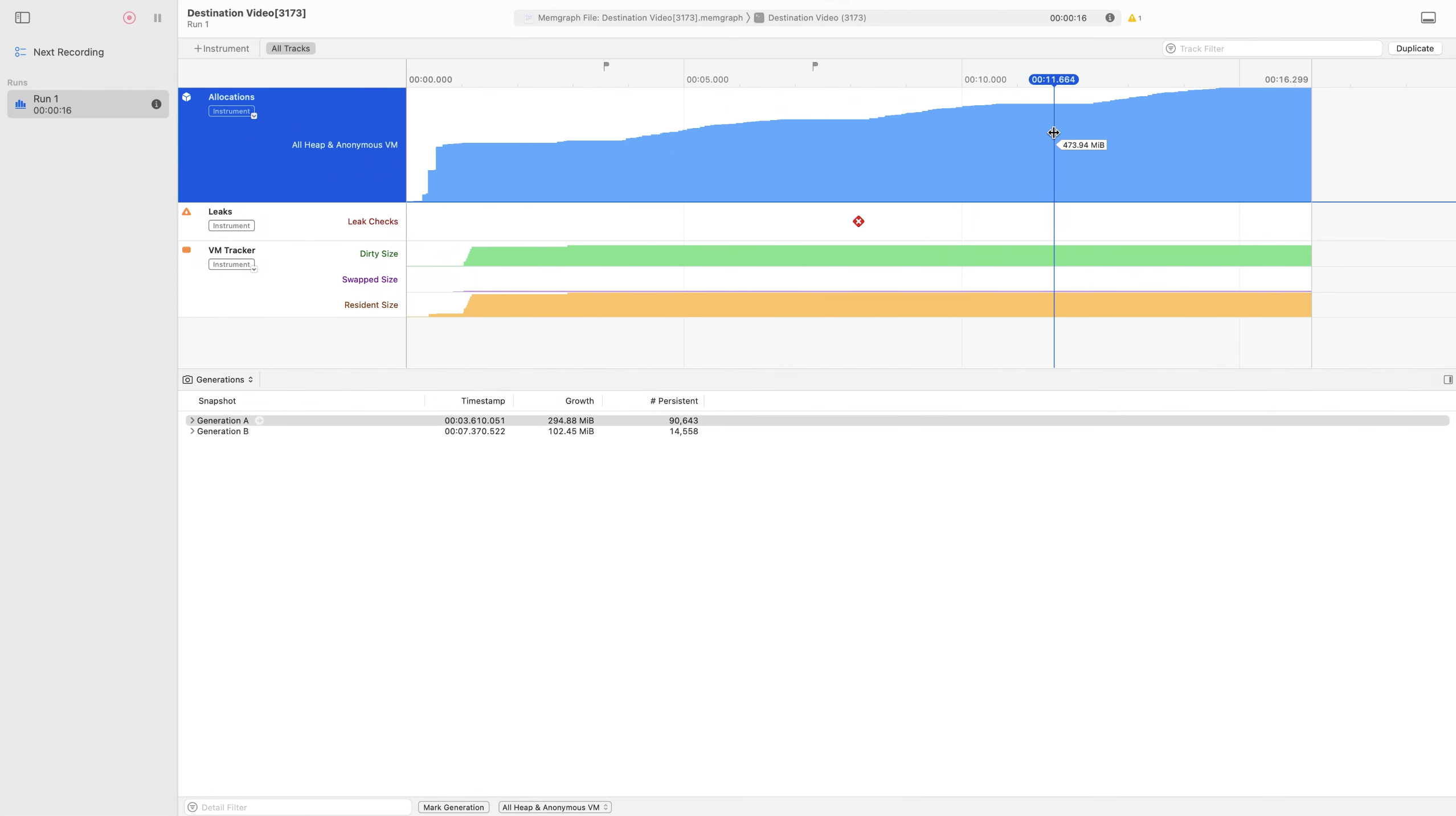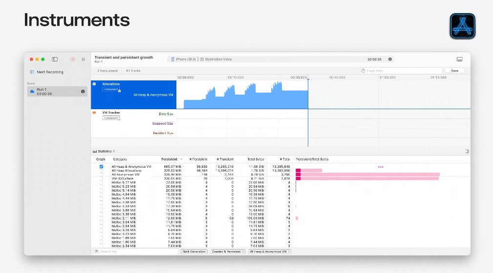 Leak instrument는 앱 메모리를 주기적으로 스냅샷을 찍어서 메모리 누수를 감지한다