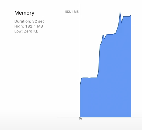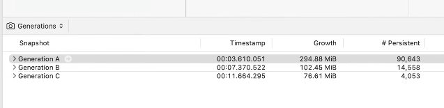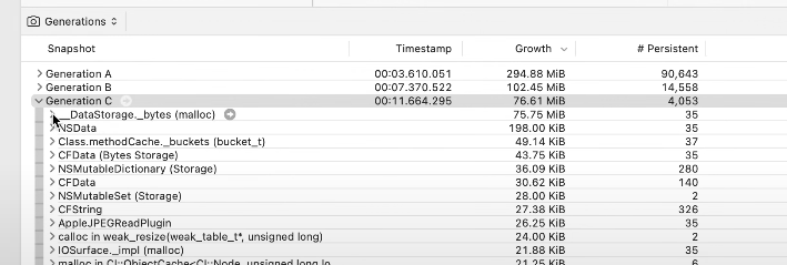 위 그래프는 여러 할당으로 나타내지는데 Allocation-instrument 의 기능 중 세대별 할당기능을 통해 시간에 따라 메모리 증가를 분석해 볼 수 있다.