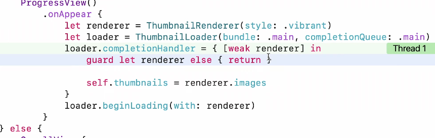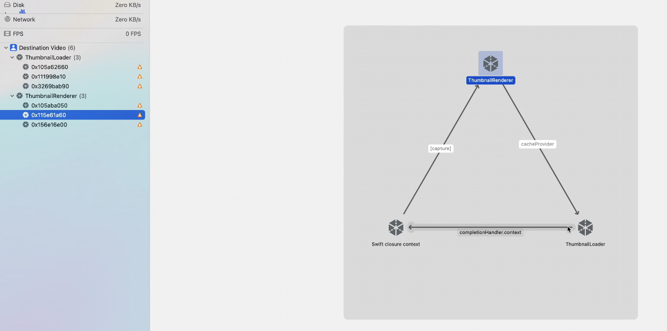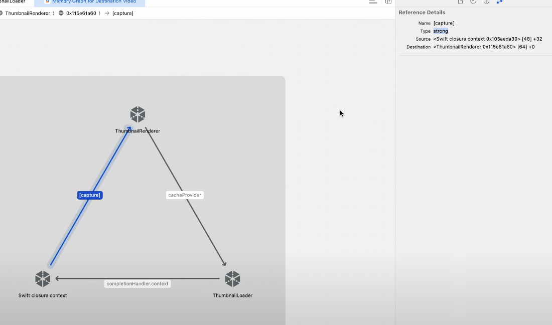 CompletionHandler 클로져가 ThumbnailRenderer를 강력하게 캡쳐하고 있고 이로인해 순환참조가 발생한다.