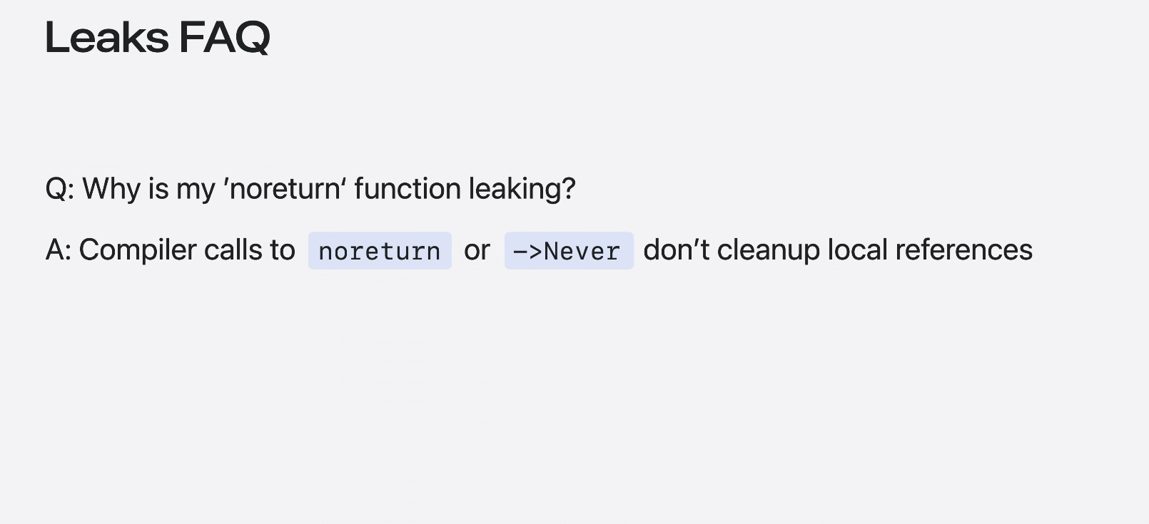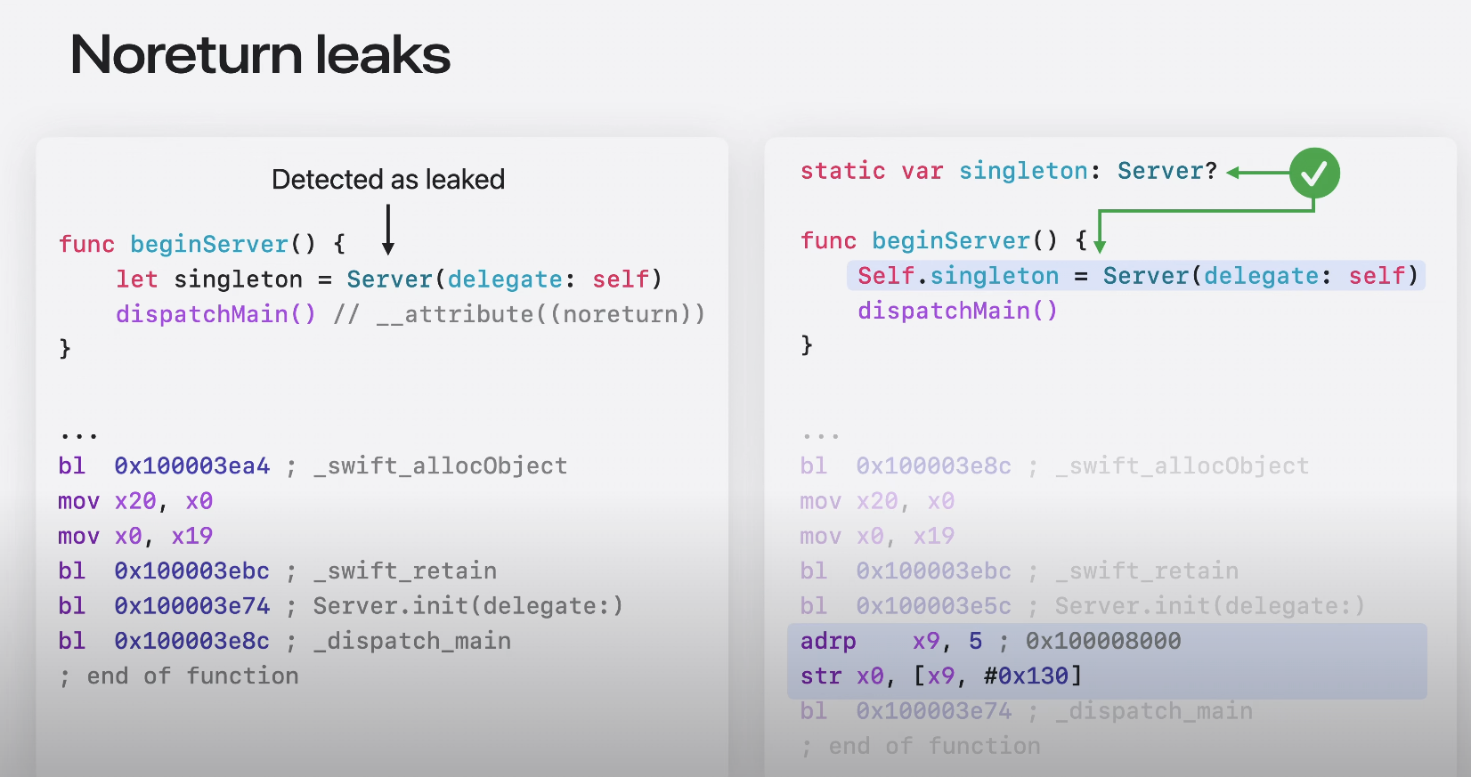 이 예제의 Server 객체와 같은 noreturn 함수 호출에서 로컬 상태가 유출된 것으로 보고되는 경우