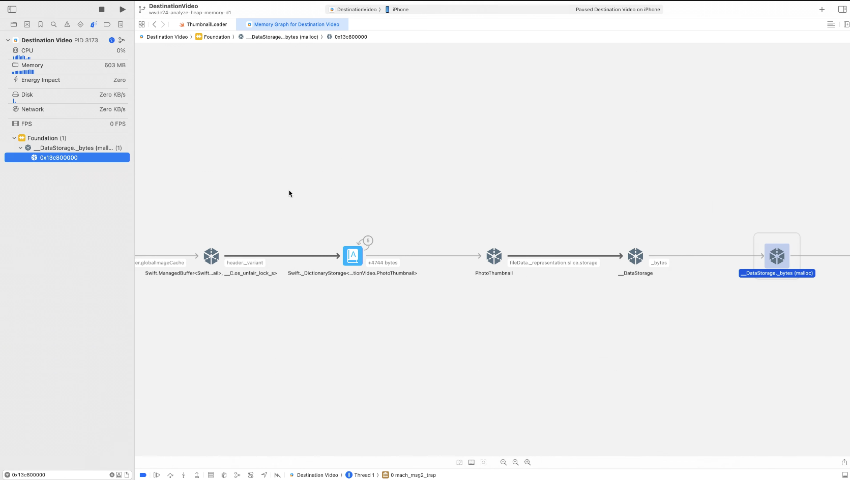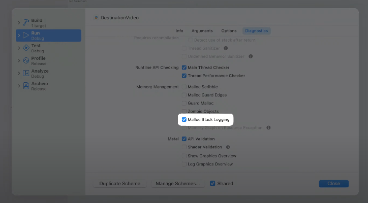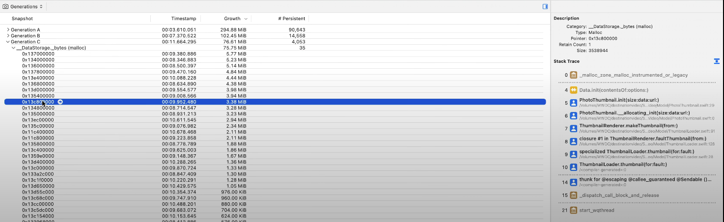MallocStackLogging을 통해 각 할당의 call stack과 time stamp 를 확인할 수 있다.