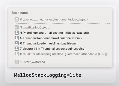 mallocStackLogging이 활성화 되어 있으면 각각 할당에 대해서 Backtrace를 제공해준다