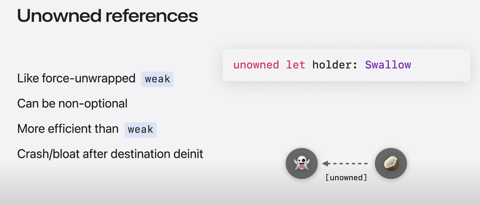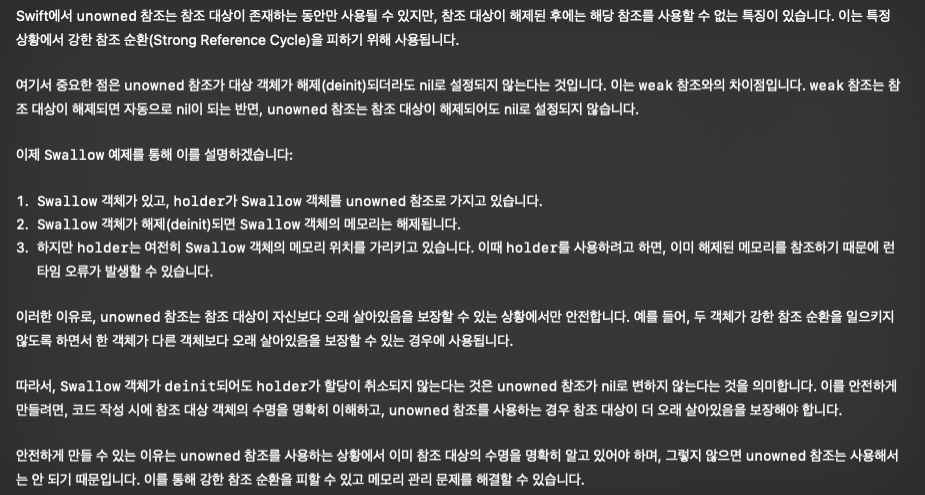 만약 holder를 unowned로 하고 우리가 참조하기 전에 Swallow가 사라지면 Swallow 는 deinit 되지만 할당이 취소되진 않는다