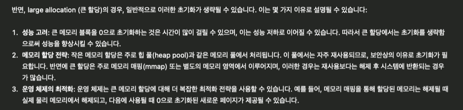 * 작은 크기의 메모리는 해제될때 메모리 블록이 0으로 초기화 되어서 메모리에서 이전 데이터를 제거하여 다른 프로세스나 할당이 이를 읽지 못하게 한다. 큰 크기의 메모리 할당의 경우 이러한 초기화가 생략된다. 왜냐하면