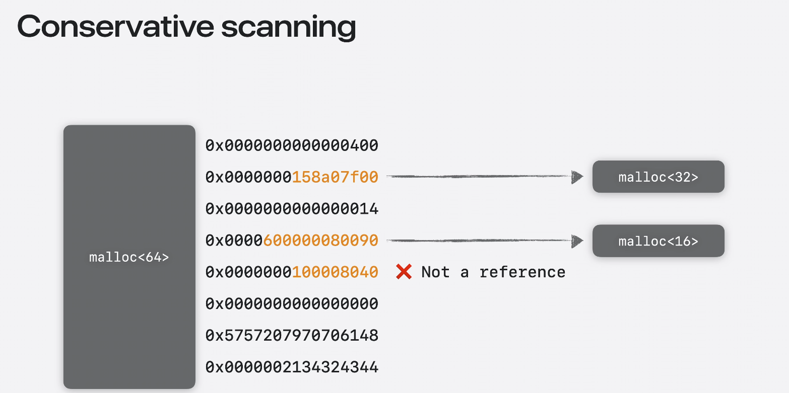tool 이 보수적으로 leak을 검색할 때 포인터를 바이트 단위로 찾고 참조로 보이는 값을 찾은다음 allocation 목록과 비교하여 확인한다