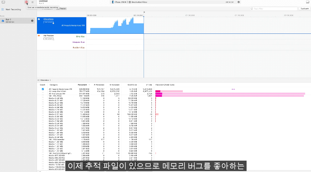 메모리 누수로 의심되는 동작시 allocation에서 점진적으로 증가하는 걸 볼 수 있다