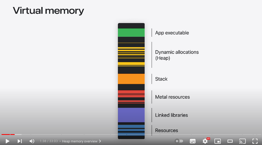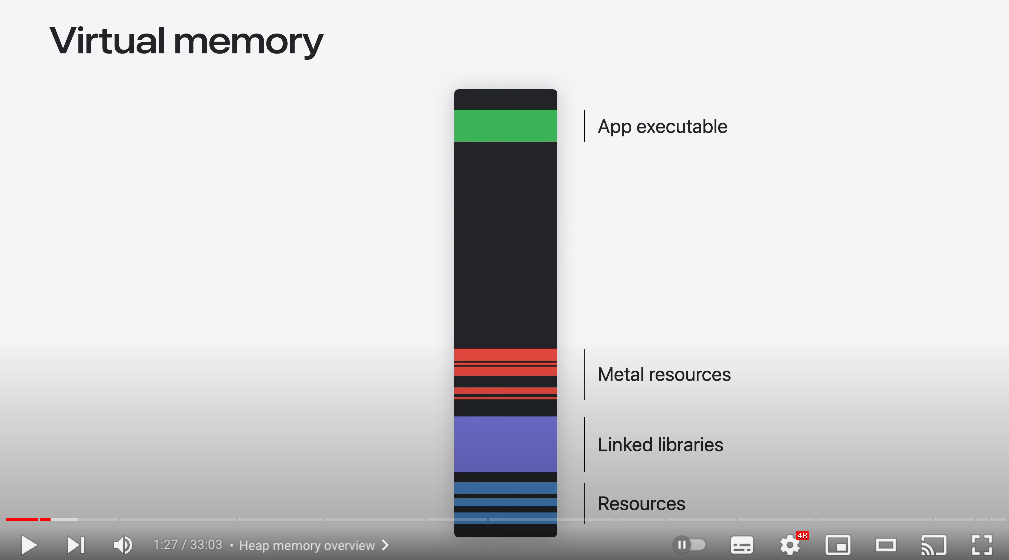 힙을 이해하려면 앱의 전체 가상 메모리 내에서 컨텍스트에 맞는 위치를 확인해야 한다