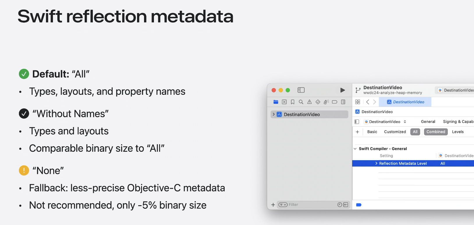 만약 메모리 그래프에 보고된 weak, unowned reference가 표시되지 않는 경우 xcode에서 프로젝트의 refrelection metadata level 빌드 설정을 확인해야 한다