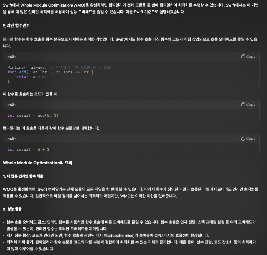 -whole-module-optimization 이 활성화 되어 있는지 확인해라 (더 많은 Inline을 허용하여 오버헤드를 줄일 수 있다)