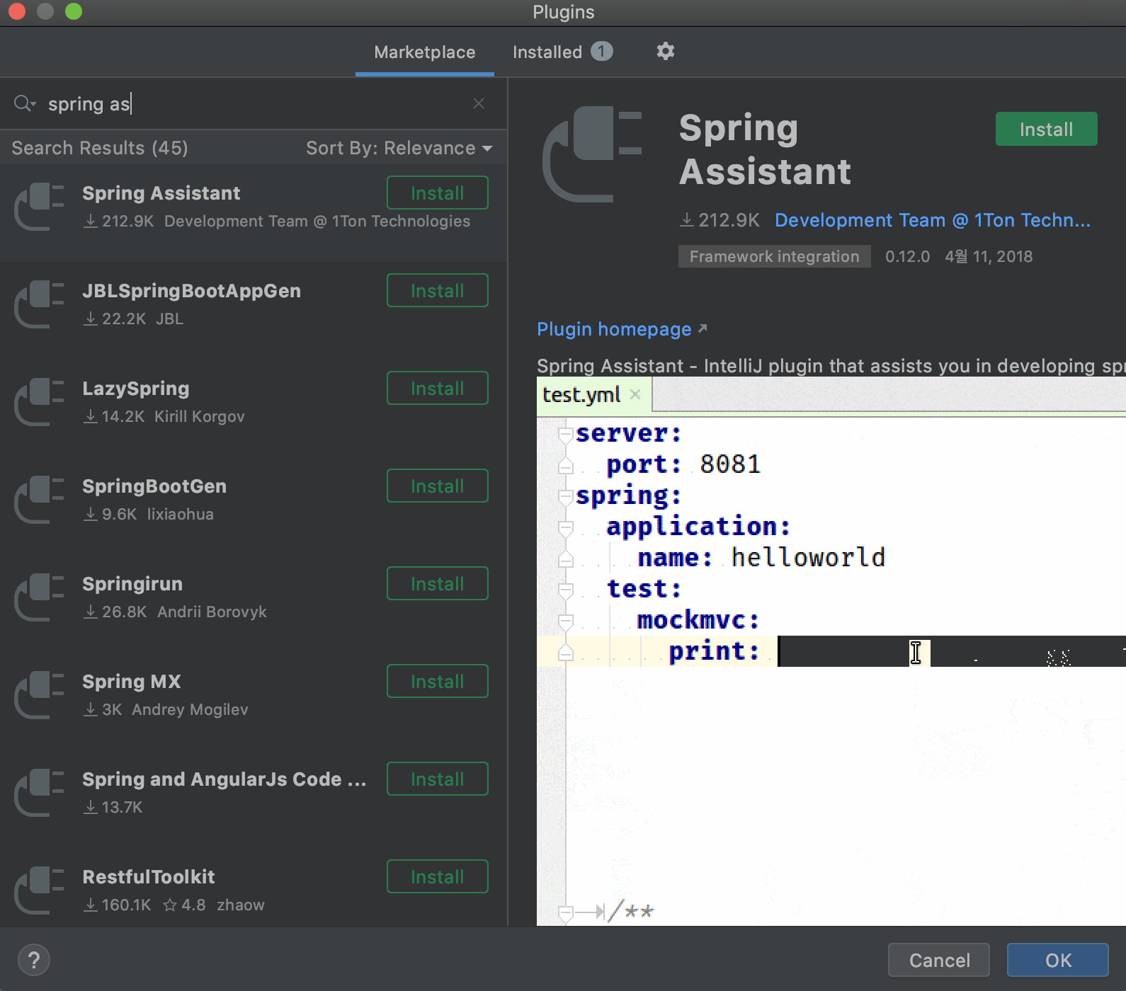 2. IntelliJ 를 실행한 뒤 Spring Assistant 를 설치한다.