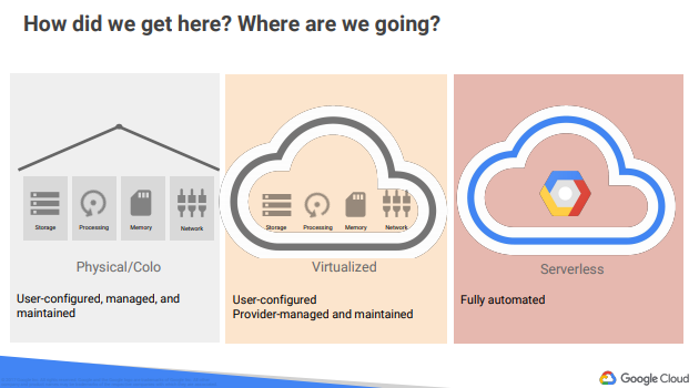 - cloud : 10년전에 구글은 이런 virtualize가 가지는 제약이 비즈니스의 성장 속도를 따라오지 못할것을 예상하고 container based architecture로 바꿨다. 구글 내부 클라우드 서비스는 자동으로 provisioning 과 인프라를 configure 해줬다. 이러한 서비스가 지금은 고객한테도 제공되고 있는 것이다.