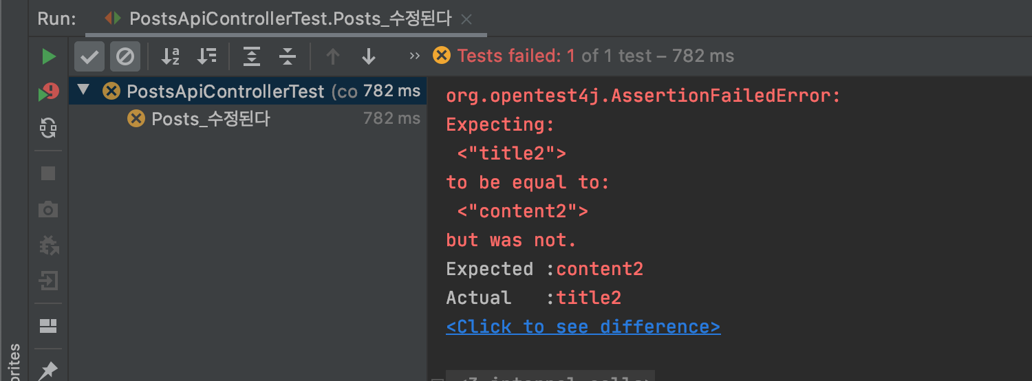 테스트 코드 옆 재생버튼을 클릭하면 테스트가 시작되고