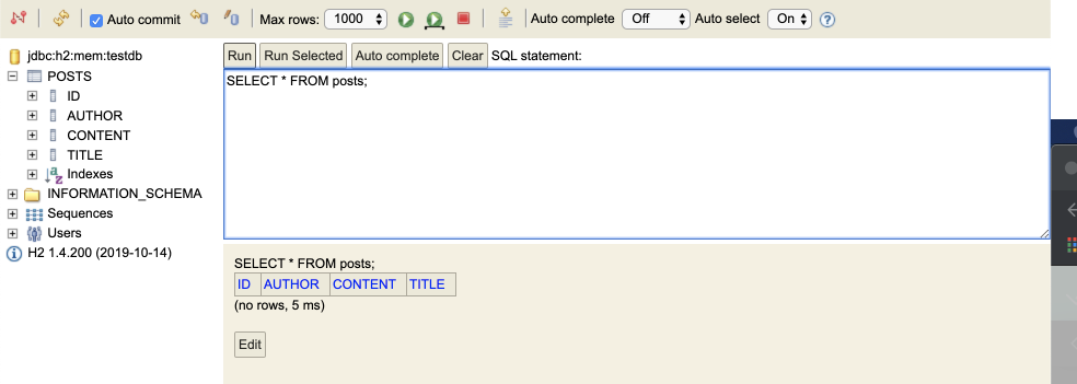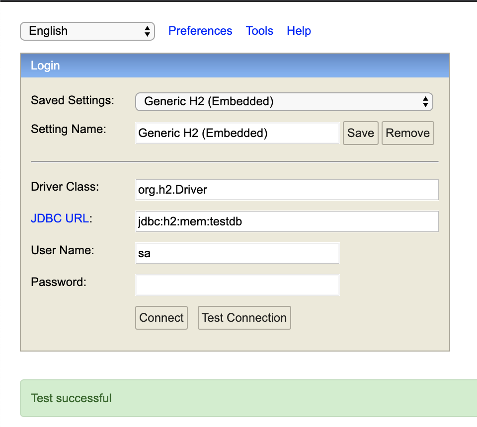 *JDBC URL 은 'jdbc:h2:mem:testdb' 로 설정해야 한다.