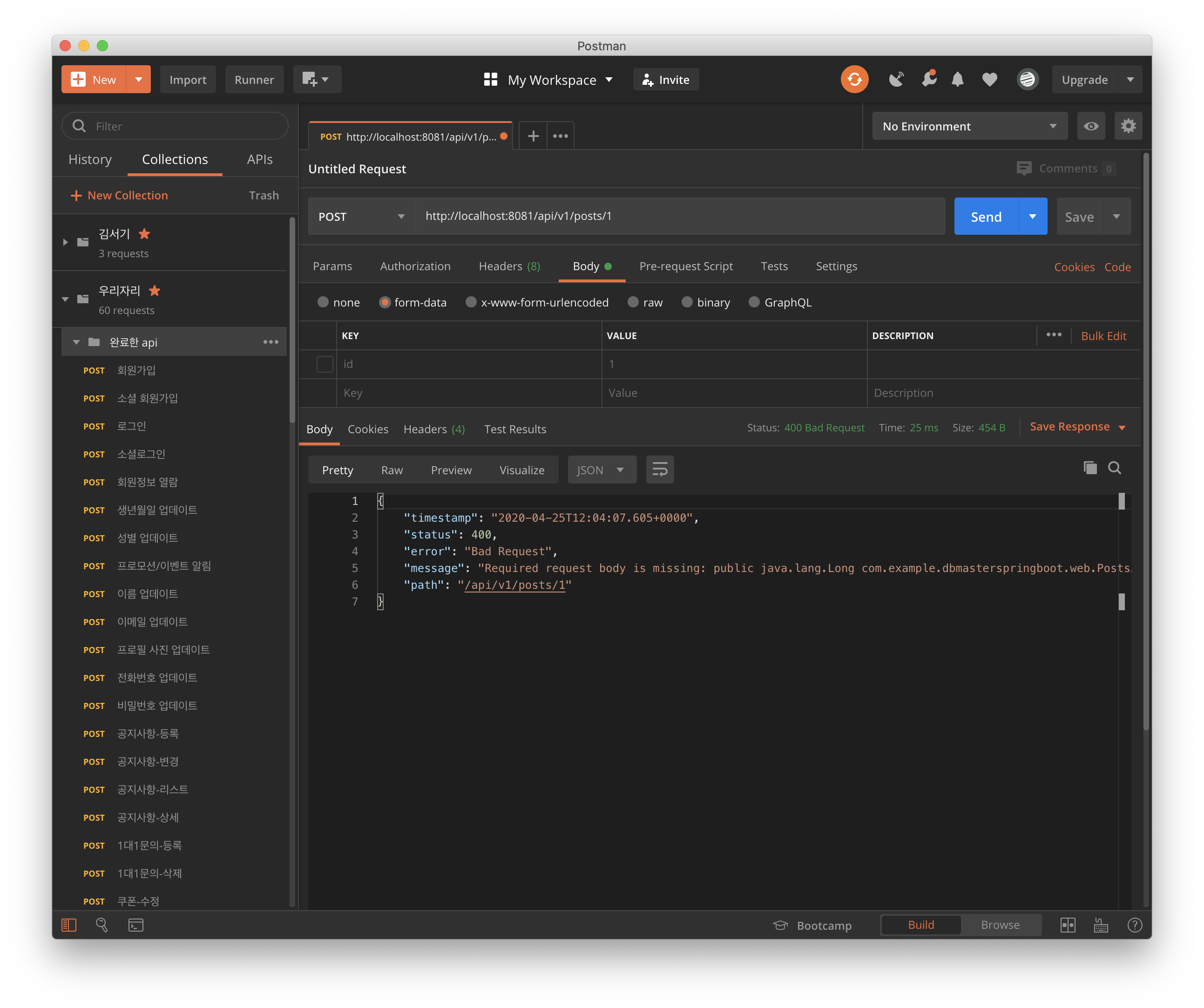 그리고 Body에 파라미터로 id 에 value 1 로 해서 POST 보냈다.
