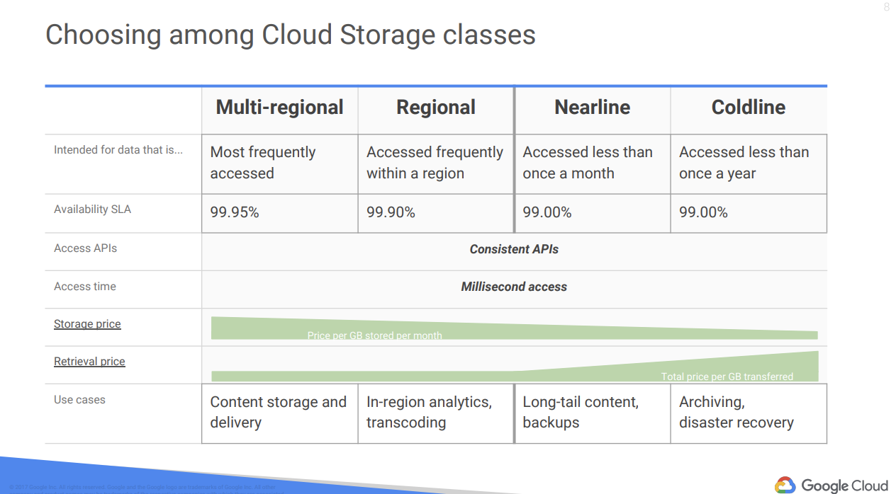 3) Neraline, Coldline : 99% - Pricing : all classes cost per gigabtye of data stored per month