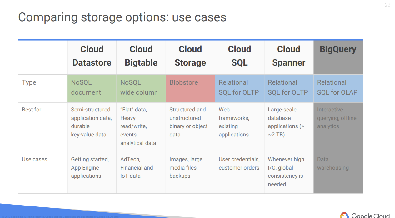 - Cloud SQL : web framworks, exsiting applications, storing user credentials and customer orders